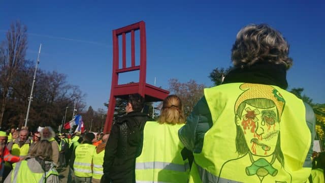 Mercredi, un millier de gilets jaunes s’étaient donné rendez-vous sur la Place des Nations. Leur but: rendre hommage aux victimes dans leurs rangs et dénoncer les violences policières. Les manifestants ont réclamé l’interdiction de l’arme suisse employée par les forces de l’ordre françaises, le LBD 40. Reportage au pied de la célèbre Broken chair: