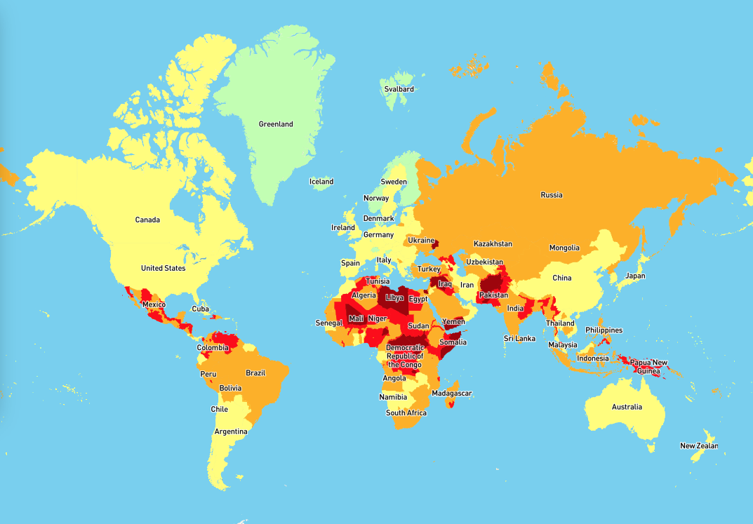 Cette carte a été réalisée par International SOS, une société singapourienne qui propose des solutions de prévention médicale, de sécurité, d’accès aux soins et d’intervention en cas d’urgence aux entreprises mettant en place des opérations à l’international. Les spécialistes ont retenus trois critères pour mesurer la dangerosité d’un pays : la sécurité globale, la sécurité routière et la santé. Chaque critère est divisé en cinq niveaux de gravité. Par exemple, pour mesurer l’état de santé d’un pays, les niveaux sont composés de bas, moyen, risque fluctuant, élevé et très élevé.